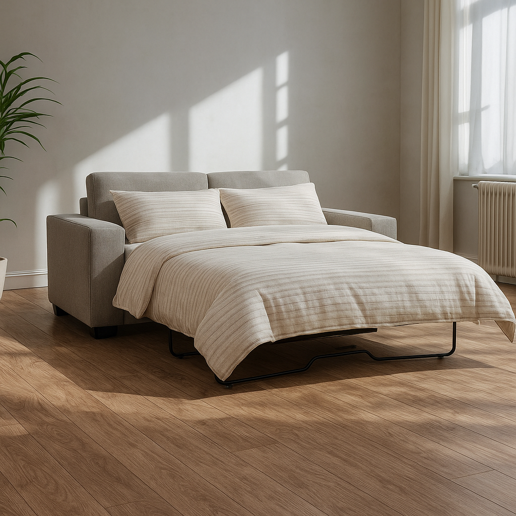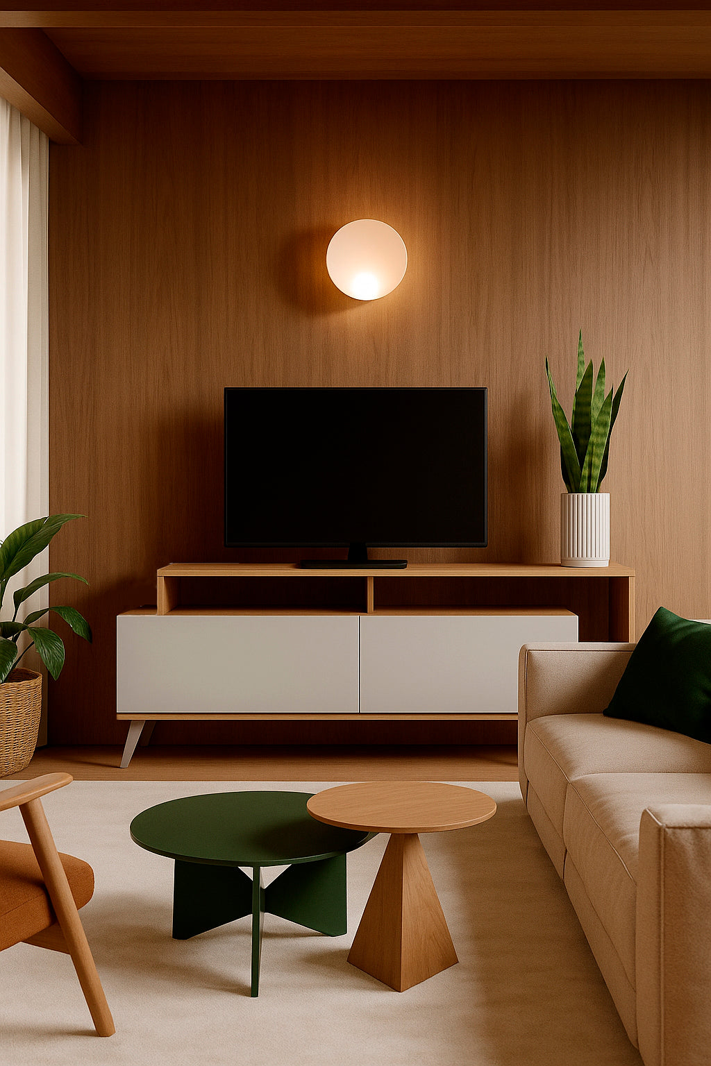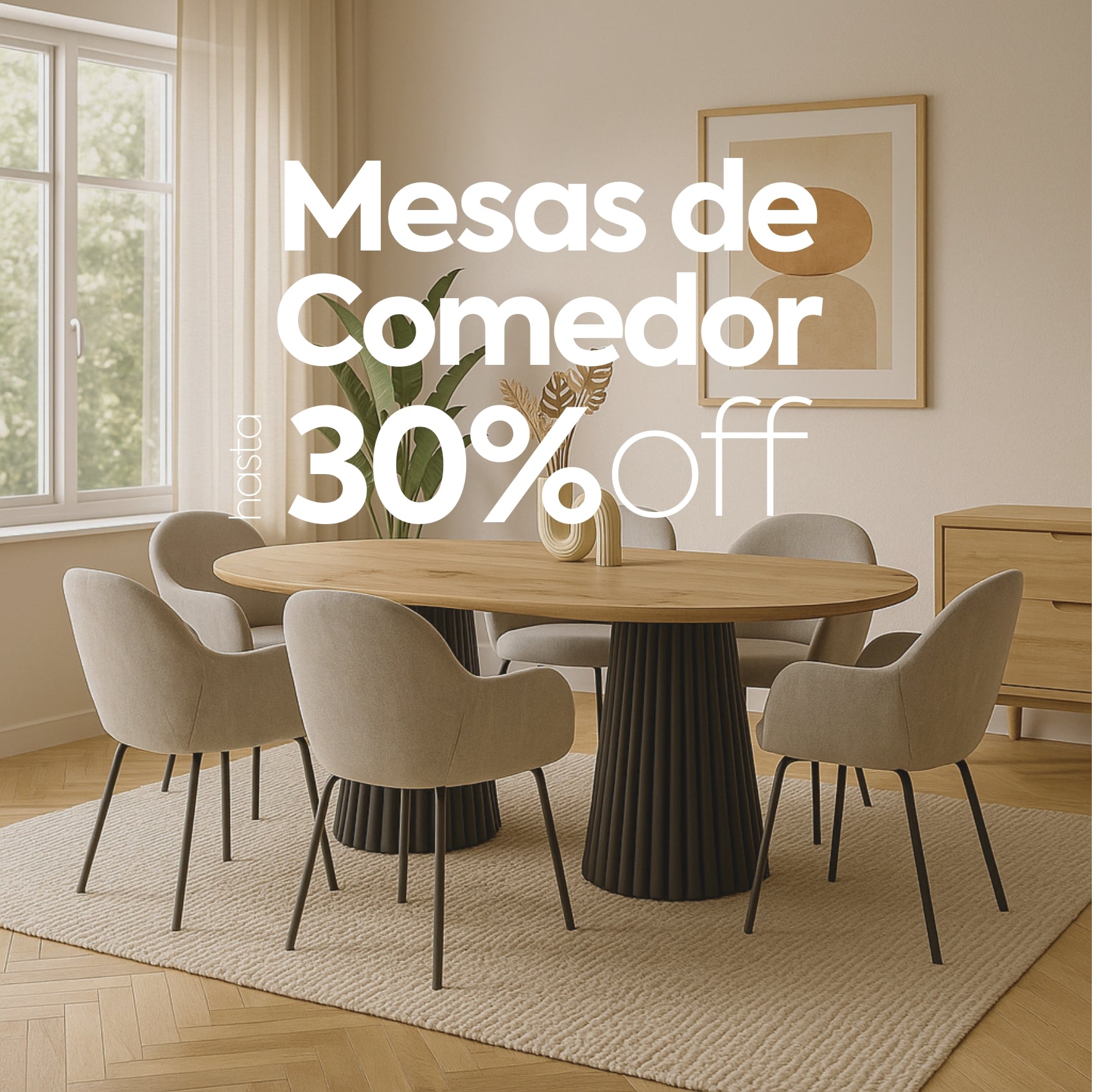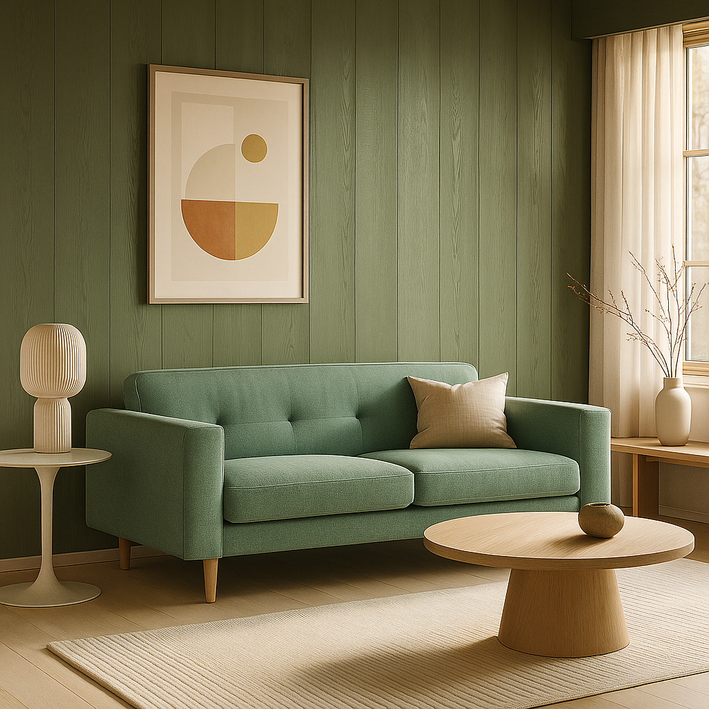 Este espacio reúne la serenidad de los tonos neutros con la expresividad sutil del arte geométrico. El sofá en tonos claros, de líneas rectas y proporciones generosas actúa como centro visual y funcional del ambiente, invitando al descanso sin esfuerzo. Los cojines con motivos vegetales aportan una textura orgánica que suaviza el conjunto, mientras que los cuadros —en una paleta de verdes, terracotas y beiges— conectan lo visual con lo emocional, creando un ritmo silencioso en la pared.