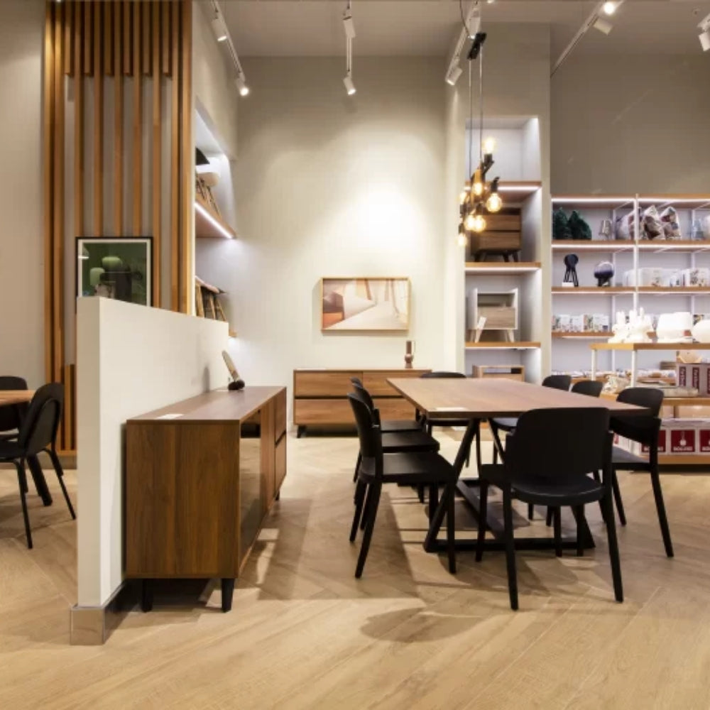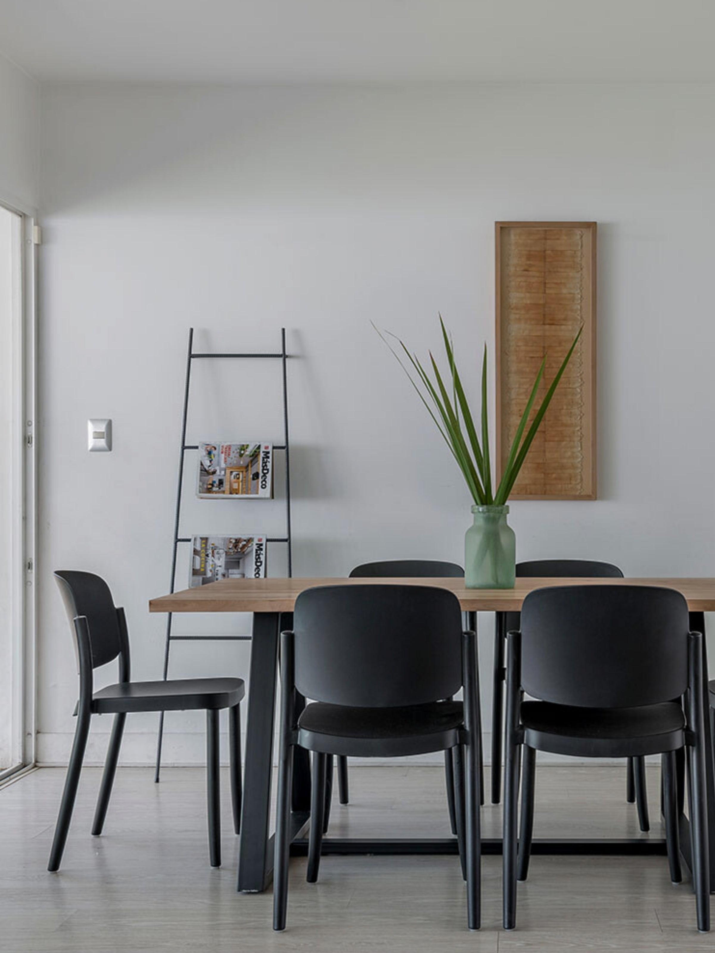 La mesa lateral metálica, con su estructura ligera y escultórica, introduce un contrapunto moderno y delicado, ideal para equilibrar la composición. Todo el conjunto respira armonía: un salón pensado para habitar con pausa, donde cada elemento convive en perfecta proporción y cada detalle contribuye a una atmósfera de sofisticación cotidiana. Ideal para quienes buscan un lenguaje visual limpio, con alma y profundidad.