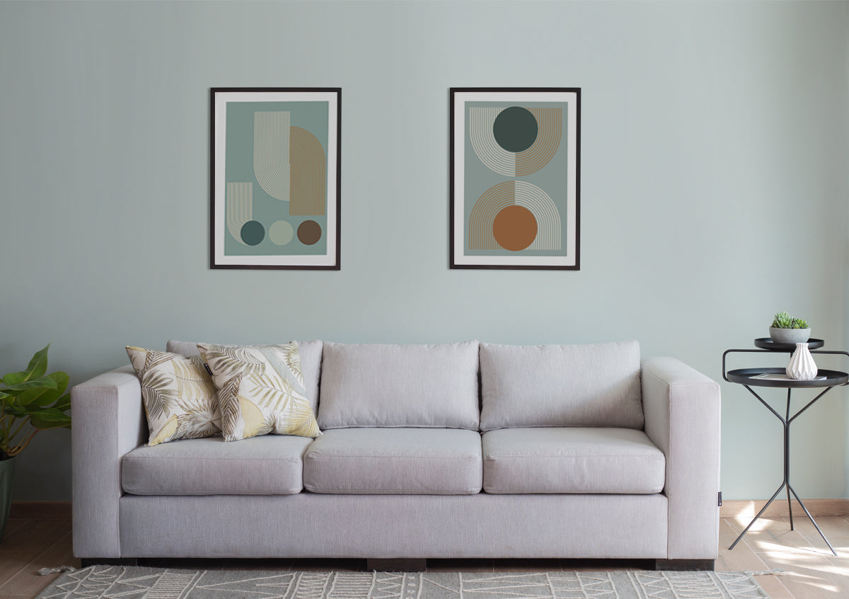 Este espacio reúne la serenidad de los tonos neutros con la expresividad sutil del arte geométrico. El sofá en tonos claros, de líneas rectas y proporciones generosas actúa como centro visual y funcional del ambiente, invitando al descanso sin esfuerzo. Los cojines con motivos vegetales aportan una textura orgánica que suaviza el conjunto, mientras que los cuadros —en una paleta de verdes, terracotas y beiges— conectan lo visual con lo emocional, creando un ritmo silencioso en la pared.